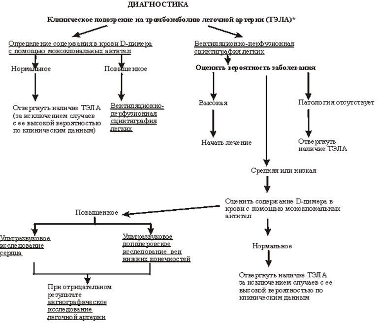 При диагностировании ТЭЛА, равно как и при подозрении на ТЭЛА, до и в процессе обследования необходимо соблюдение строгого постельного режима. Это правило должно выполняться и при относительно удовлетворительном состоянии, при маловыраженной клинике, потому что всегда имеется угроза рецидива эмболии. Больной должен быть госпитализирован в отделение интенсивного наблюдения или в реанимационное, с возможностями эндоназального введения кислорода, непрямого массажа сердца, длительных внутривенных инфузий посредством катетеризации вен.