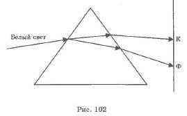 Как уже говорилось, свет, проходя через трехгранную призму, преломляется и при выходе из призмы отклоняется от своего первоначального направления к основанию призмы. Величина отклонения луча зависит от показателя преломления вещества призмы, и, как показывают опыты, показатель преломления зависит от частоты света. Зависимость показателя преломления вещества от частоты (длины волн) света называется дисперсией.О чень просто наблюдать явление дисперсии при пропускании белого света через призму (рис. 102). При выходе из призмы белый свет разлагается на семь цветов: красный, оранжевый, желтый, зеленый, голубой, синий, фиолетовый. Меньше всех отклоняется красный свет, больше - фиолетовый. Это говорит о том, что стекло имеет для фиолетового света наибольший показатель преломления, а для красного - наименьший. Свет с разными длинами волн распространяется в среде с разными скоростями: фиолетовый с наименьшей, красный - наибольшей, так как n= c/v ,