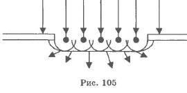 На рис. 105 изображена плоская световая волна, падающая на непрозрачный экран с отверстием. За экраном фронт результирующей волны (огибающая всех вторичных волн) искривляется, в результате чего свет отклоняется от первоначального направления и попадает в область геометрической тени.
