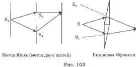 Сложение двух волн, вследствие которого наблюдается устойчивая во времени картина усиления или ослабления результирующих световых колебаний в различных точках пространства, называют интерференцией (рис. 103). Интерферировать могут только когерентные волны - волны, имеющие одинаковую частоту (длину волны) и постоянную во времени разность фаз. Для получения когерентных волн свет от одного источника делят тем или иным способом на две части примерно равной интенсивности, создают между ними разность хода волн, а затем снова сводят вместе. Существует несколько способов получения когерентных световых волн.