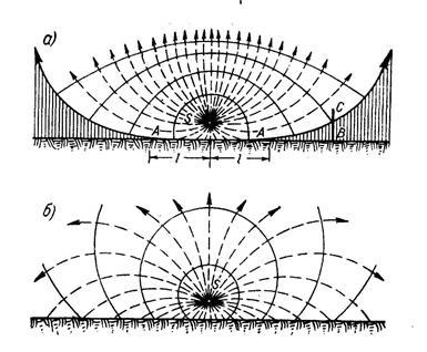Левее и правее ± l на рис. а лежит зона молчания (заштрихована), так как звуковые волны уходят вверх от земной поверхности.