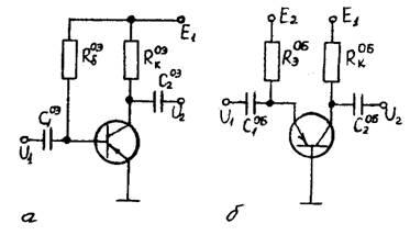 Рис 1.1 Підсилювальні каскади на біполярних транзисторах,,включені за схемою: а) з загальним емітером; б) з загальною базою