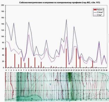 Прямой метод локализации кварцевых жил основан на сейсмоэлектрическом эффекте 1 рода (пьезоэлектрический метод), за счет очень высокого пьезомодуля кварца, по сравнению с другими минералами и горными породами. Наблюдения проводились с шагом 1м опытным макетом аппаратуры УРС-2 (Усилитель-Регистратор Сигналов) и заключались в одновременной регистрации сигналов сейсмического и электрического отклика, в диапазоне 100Гц - 16кГц, от ударного воздействия. В качестве датчика электрического поля выступала незаземленная симметричная антенна ( l =1.5м), сейсмоприемник - пьезопленочный акселерометр (К = 2 мВ·с2/м), удары производились небольшой кувалдой, в пределах 1м от установки. Спектральный состав пьезосигнала имел максимум распределения в районе 200 - 800 Гц, в ряде случаев наблюдались пики в диапазонах: 1.2 - 2.5кГц, 5 -6кГц, 8кГц. Спектр сейсмоакустического сигнала носил более низкочастотный характер и имел свои гармоники, в основном не совпадающие с пьезоэлектрическими. Обработка заключалась в энергетической RSM-нормировке электрического сигнала к сейсмическому, полученная величина и является пьезоэлектрическим параметром в данной точке. Полученные результаты свидетельствуют о достаточно уверенной корреляции сейсмоэлектрики с положением кварцевых жил (см. рис.1 ).