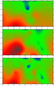 На рисунке 2 представлен пример сопоставления разрезов, пройденных ходом на юг (верхний), ходом на север (средний) и просуммированная трасса (нижняя) над проложенной в земле металлической трубой (диаметром 0,5 м на глубине около 4 м). Как видно из рисунка, труба хорошо выделяется при одиночном проходе только в одном направлении, возможно за счет “экранного” эффекта стенок канавы и таяния снега в северном углу. Однако при суммировании трасс, получаем очень контрастное выделение трубы в разрезе и меньший эхо-сигнал.