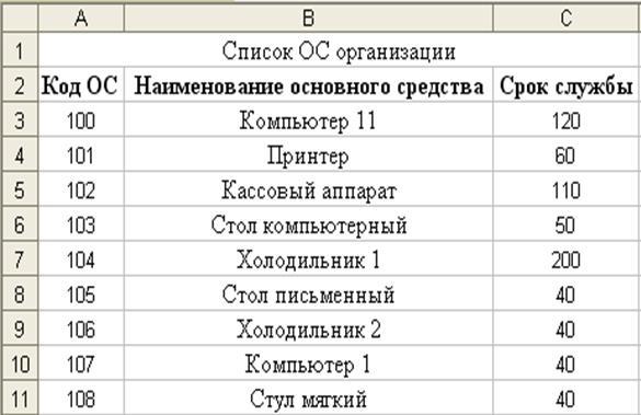 4. На рабочем листе Основные средства MSExcelсоздала таблицу списка ОС организации.