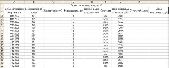 Рис.3. Расположение таблицы «Расчет суммы амортизации ОС» на рабочем листе Амортизация ОС MSExcel