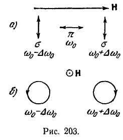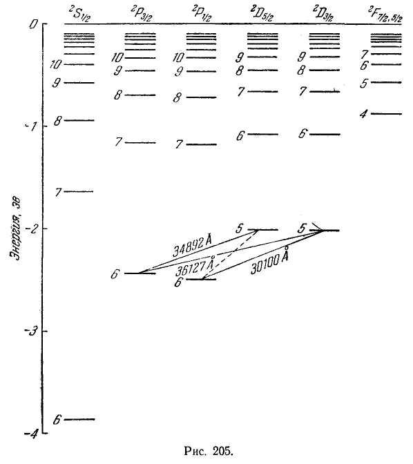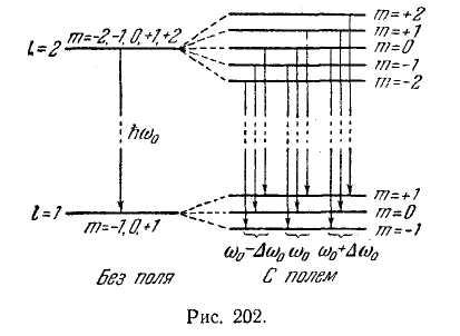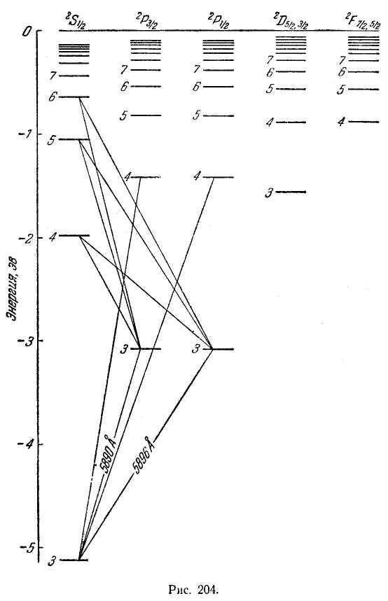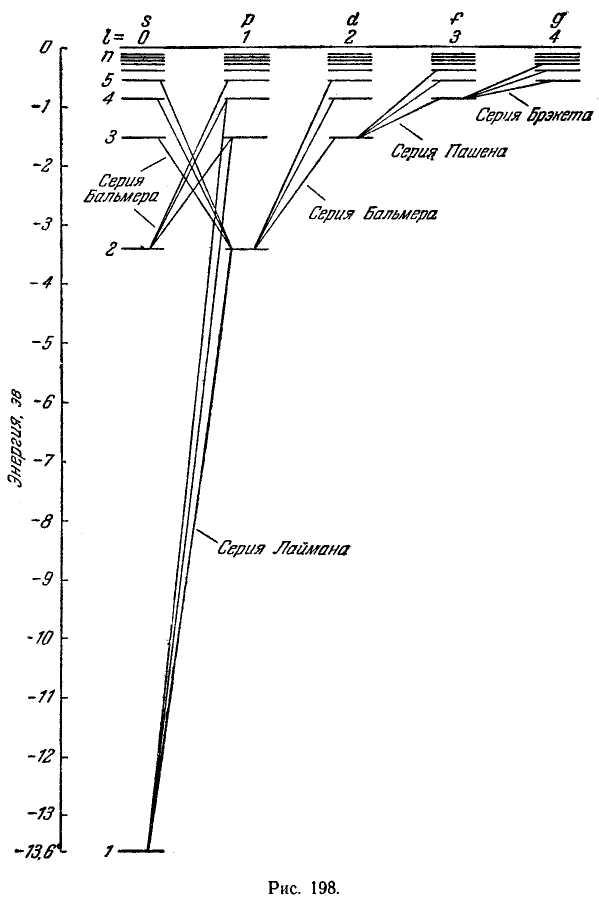 за счет столкновения атома с достаточно быстрым электроном, или, наконец, за счет поглощения атомом фотона. Фотон при поглощении его атомом исчезает, передавая атому всю свою энергию. Атом не может поглотить только часть фотона, ибо фотон, как и электрон, как и  Рис.5 другие элементарные частицы, является неделимым. Поэтому атом может поглощать только те фотоны, энергия которых в точности соответствует разности энергий двух его уровней. Поскольку поглощающий атом обычно находится в основном состоянии, спектр поглощения водородного атома должен состоять из линий, соответствующих переходам 1s np (n = 2, 3, ...). Этот результат полностью согласуется с опытом. Собственные функции s-состояний (т. е. состояний с l = 0) оказываются не зависящими от углов и . Это можно записать следующим образом:  Вероятность найти электрон в тонком шаровом слое радиуса r и толщины dr согласно (66.1) равна . Выражение представляет собой плотность вероятности нахождения электрона на расстоянии r от ядра. Волновые функции для l, отличных от нуля, распадаются на два множителя, один из которых зависит только от r, а другой — только от углов и . Таким образом, и в этом случае можно ввести понятие плотности вероятности нахождения электрона на расстоянии r от ядра, подразумевая под R(r) ту часть функции , которая зависит только от r. На рис. 5 приведены плотности вероятности для случаев: 1) п = 1, l = 0; 2) п = 2, l = 1 и 3) п = 3, l = 2. За единицу масштаба для оси r принят радиус первой боровской орбиты. На графиках отмечены радиусы соответствующих боровских орбит. Как видно из рисунка, эти радиусы совпадают с наиболее вероятными расстояниями электрона от ядра. |