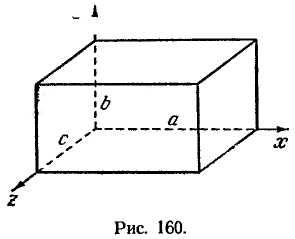 В результате стенки второй полости станут поглощать больше энергии, чем излучать, и температура их начнет повышаться. Стенки же первой полости станут поглощать меньше энергии, чем излучать, так что они будут охлаждаться. Однако два тела с первоначально одинаковой температурой не могут вследствие теплообмена друг с другом приобрести различные температуры — это запрещено вторым началом термодинамики. Поэтому наше допущение о неодинаковости u1 и и2 должно быть признано неправомерным. Вывод о равенстве u1(Т) и и2(Т) распространяется на каждую спектральную составляющую u(ω,Т). Независимость равновесного излучения от природы стенОк полости можно пояснить следующими соображениями. Абсолютно черные стенки поглощали бы всю упавшую на них энергию Фэ и испускали бы такой же по величине поток энергии Фэ. Стенки с поглощательной способностью а поглотят долю аФэ упавшего на них потока Фэ и отразят поток, равный (1—а)Фэ. Кроме того, они излучат поток аФэ (равный поглощенному потоку). В итоге стенки полости вернут излучению поток энергии Фэ = (1—а)Фэ + аФэ, такой же, какой возвращали бы излучению абсолютно черные стенки. Равновесная плотность энергии излучения и связана с энергетической светимостью абсолютно черного тела R*э простым соотношением, которое мы сейчас выведем. В случае плоской волны (т. е. когда энергия переносится волной в одном, определяемом вектором k направлении) плотность потока энергии I может быть представлена как произведение плотности энергии и на скорость волны с: I = си. Через каждую точку внутри полости проходит бесчисленное количество волн, направления которых равномерно распределены в пределах телесного угла 4л. Поток энергии I = си также распределен равномерно в пределах этого телесного угла. Следовательно, в пределах телесного угла dQ будет заключен поток энергии, плотность которого равна: . Возьмем на поверхности полости элементарную площадку ΔS . Эта площадка посылает в пределах телесного угла в направлении, образующем с нормалью угол , поток энергии:  По всем направлениям, заключенным в пределах телесного угла 2π, площадка ΔS посылает поток энергии: . Вместе с тем поток Фэ должен быть таким, какой излучали бы абсолютно черные стенки. Последний же поток по определению равен R*эΔS. Следовательно, (19) Соотношение (19) должно выполняться для каждой спектральной составляющей излучения. Отсюда вытекает, что (20) Рэлей и Джине исходили из того, что равновесное излучение в полости представляет собой систему стоячих волн. Такое представление оправдывается тем, что замена поглощающих стенок полости идеально отражающими стенками не изменяет плотности энергии равновесного излучения. Возникновение стоячих волн возможно лишь при выполнении определенных условий. Пусть полость имеет форму прямоугольного параллелепипеда со сторонами a, b и с. Совместим с ребрами параллелепипеда координатные оси х, у, z . Условие возникновения стоячей волны вдоль оси х имеет вид: (21) г де kx — модуль волнового вектора, совпадающий в дан ном случае с проекцией волнового вектора на ось х. За- метим, что данная стоячая волна образована наложением двух бегущих волн, для которых значения kx отличаются знаком. Для стоячих волн, устанавливающихся вдоль оси у или оси z, должны выполняться условия, аналогичные (21). Если волновой вектор к не совпадает с направлением 