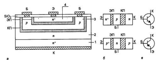 Центральную часть монокристалла называют базой (Б). С одной стороны к базе примыкает область с высокой концентрацией примеси, называемая эмиттером (Э), с другой – область с низкой концентрацией примеси, называемая коллектором (К). Между базой и эмиттером находится эмитерный переход (ЭП), между базой и коллектором – коллекторный переход (КП). Взаимодействие между переходами будет существовать, если толщина базы много меньше диффузионной длины не основных носителей заряда. На рисунке 1.1 показана структура кремневого монокристалла, изготовленного по эпитаксиально-планарной технологии, которая характерна для большинства современных транзисторов. На сильнолегированной подложке 1 n+-типа методом эпитаксии сформирован слаболегированный слой 2 n-типа толщиной около 10 мкм, в котором методом локальной диффузии созданы слой базы 3 с дырочной электропроводностью и слой эмиттера 4 n+-типа. Толщина базового слоя составляет около 1 мкм. На поверхности кристалла расположен защитный слой диоксида кремния SiO2 толщиной порядка 1мкм, через отверстия в котором осуществлены металлические выводы от эмиттера и базы. Тонкая база имеет значительную протяженность в горизонтальном направлении, поэтому она обладает сравнительно большим сопротивлением. Чтобы снизить это сопротивление, от базы делают два вывода, которые соединяют вместе.
