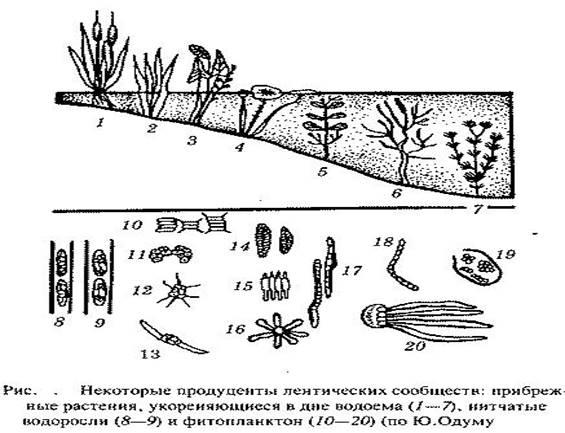 Лентические экосистемы в литоральной зоне содержат два типа продуцентов: укрепившиеся в дне цветковые растения и плавающие зеленые растения — водоросли, некоторые высшие (рдесты) (Рис.1). Растения, укрепленные в дне, образуют три концентрические зоны: