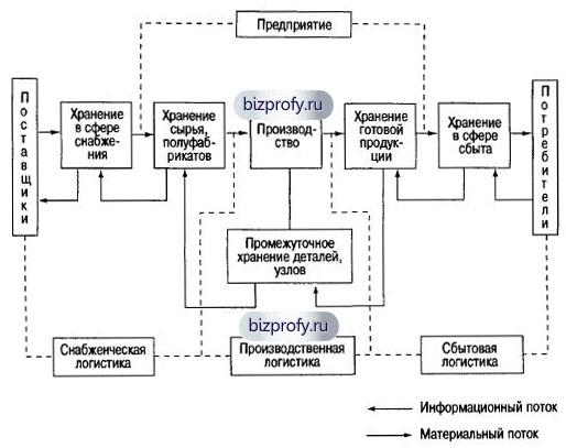 В логистической цепи, т.е. цепи, по которой проходят товарный и информационный потоки от поставщика до потребителя, выделяются следующие главные звенья: поставка материалов, сырья и полуфабрикатов; хранение продукции и сырья; производство товаров; распределение, включая отправку товаров со склада готовой продукции; потребление готовой продукции.