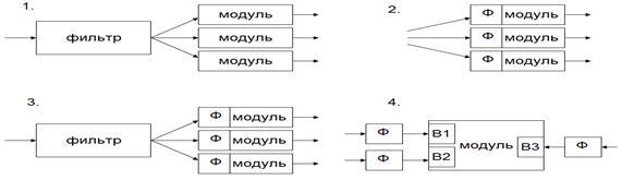 Четвертый вариант является просто отдельным случаем, когда модуль может иметь несколько входов, при этом у каждого из которых могут свои требования к фильтрам.