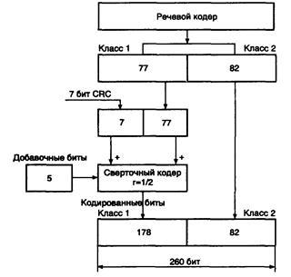 Для канального кодирования используется сверточный код со скоростью r = 1/2. В этом процессе пакет в 159 бит от речевого кодера разбивается на две группы бит: класс 1-77 бит, класс 2-82 бита. В группе бит 1 класса осуществляется указанное сверточное кодирование, причем 7 бит используются для обнаружения ошибок, биты второго класса передаются без кодирования. В результате преобразований в канальном кодере речевой фрагмент 20 мс представляется 260 битами, что соответствует скорости передачи 13 кбит/с.