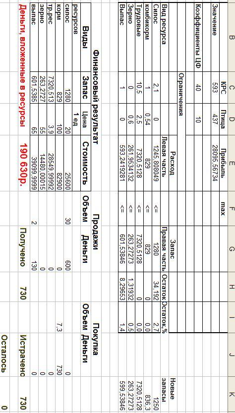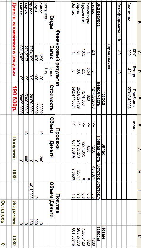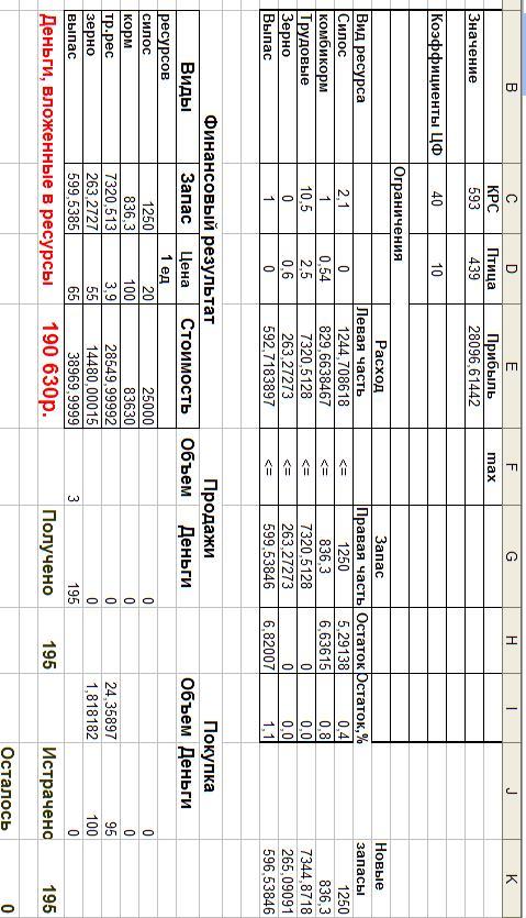 При решении задачи линейного программирования традиционным итерационным методом удалось добиться почти полного использования запасов ресурсов. Их остатки составили менее одного процента от запасов. В этом случае может быть произведено 600 голов КРС и 343 десятков индюков. При этом может быть получено 25713 у.е. прибыли.