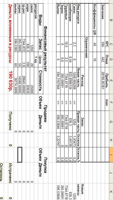 Затем задача была решена при дополнительных ограничениях «снизу» (обязательное производство птицы для собственного потребления) и «сверху» (ограничение по возможностям реализации КРС).