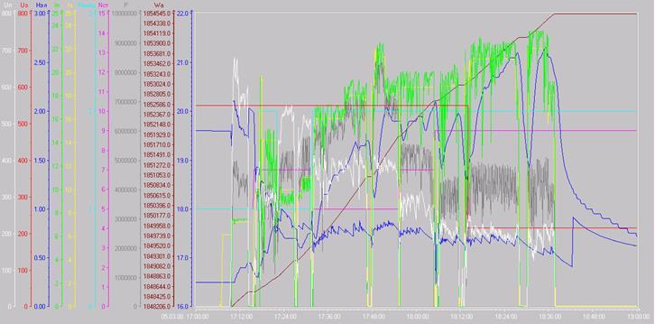 Исследования работы печи с предложенной системой управления проводилось с использованием разработанного при участии автора исследовательского комплекса, входящего в состав системы управления печью. Комплекс позволяет регистрировать основные электрические и тепловые величины, определяющие работу печи, архивировать с возможностью передачи и просмотра данных по каждой конкретной плавке и группе плавок, а также проводить первичную обработку полученной информации для последующего анализа. Кроме того, разработанный комплекс позволяет снимать различного рода регистрограммы, иллюстрирующие изменение электрических и тепловых величин (см. рис.12).