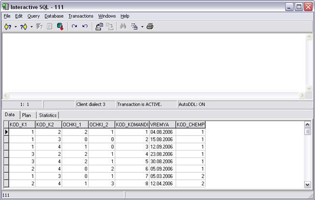 CREATE TABLE "MATCHI" ("KOD_K1" INTEGER NOT NULL, "KOD_K2" INTEGER, "OCHKI_1" INTEGER, "OCHKI_2" INTEGER, "KOMANDA_1" VARCHAR(20), "KOMANDA_2" VARCHAR(20), "KOD_KOMANDI" INTEGER NOT NULL, "VREMYA" DATE, "KOD_CHEMP" INTEGER NOT NULL, PRIMARY KEY ("KOD_KOMANDI", "KOD_CHEMP"));