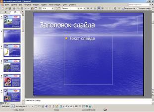 Выполним щелчок в этом шаблоне, в результате на экране появится окно Создать слайд. Выберем двойным щелчком нужный вид слайда, после чего слайд появится на экране. Однако он не будет иметь художественного оформления, и мы можем самостоятельно полностью разработать его дизайн.