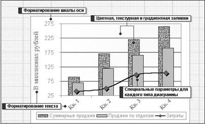 Эта процедура используется для изменения цветов, применения текстур или узоров, а также изменения ширины линии или типа границы для маркеров данных; области диаграммы; области построения; линий сетки, осей и подписей делений на плоских и объемных диаграммах; планок погрешностей на плоских диаграммах; а также стенок и основания на объемных диаграммах.