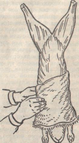 Снимают шкурку трубкой (рис. 1); допускается и снятие ее пластом с разрезом посередине черева. Перед съемкой у тушки удаляют уши и передние лапы по запястный сустав. Забеловку и съемку шкурок с тушек кроликов производят в следующей последовательности: девают круговой надрез вокруг скакательных суставов задних лап, далее от скакательного сустава Виной задней лапы к другой ведут надрез по внутренней стороне голени и Ведра, посередине анального отверстия. После надрезания шкурку снимают с задних лап, затем Вт хвоста к голове до передних лап, не допуская при этом ее повреждения и не применяя, по возможности, ножа, высвобождают передние лапы и, осторожно подрезая шкурку вокруг глаз, носа и губ, снимают ее с головы. При убое кроликов с отрезанием головы шкурку забеловывают и снимают в такой же последовательности, за исключением операции съемки шкурки с головы.