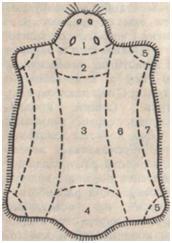 С учетом направления роста волосяного покрова шкурку можно разделить (раскроить) на три участка, которые более однородны по толщине мездры, высоте и толщине слоя волос и на правлению роста волосяного покрова. Первый участок составляет площадь шкурки от загривка до основания хвос та, а в ширину — весь хребет и 2/з бока; второй — нижняя часть шкурки, то есть черево и края боков; третий — душка.