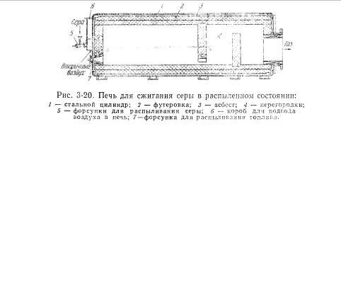 Печь для сжигания серы в распыленном состоянии (рис. 3-20) представляет собой стальной горизонтальный цилиндр 1 (диаметр 3,4 м, длина 10,5 м), футерованный огнеупорным кирпичом 2. Расплавленная сера подается в две форсунки 5, расположенные в торцовой части печи. Основное количество воздуха, необходимого для горения серы, подается в короб 6, дополнительный (вторичный) воздух через отверстия в стенке цилиндра печи.