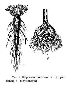 Корни растений представляют очень большое разнообразие по способу ветвления, морфологии и экологическим типам. В зависимости от происхождения различают главный корень, корни боковые и придаточные. Главный корень возникает только из зародышевого корешка семени. Придаточные берут начало от многих органов растения: стеблей, листьев, клубней, луковиц, но только не от зародышевого корешка и не от главного корня и его системы. От главного и придаточного корней отходят соответственно боковые корни — оси второго и последующих порядков. Если главный корень превосходит боковые по длине и толщине, то такая корневая система называется стержневой (рис. 1, а). Стержневая корневая система встречается у голосеменных растений (сосна, ель и др.), а также у покрытосеменных из класса двудольных. Стержневые корни, ветвящиеся в верхних слоях почвы, называются ветвистыми, а в случаях, когда ветвление начинается на глубине, — неветвистыми. Однодольные растения стержневых корней не имеют.