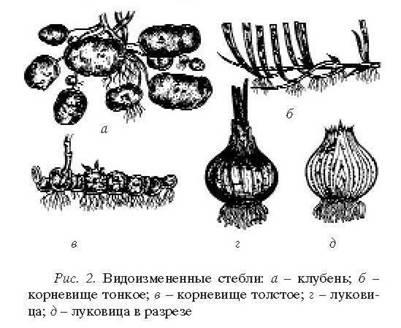 К подземным частям растений относятся также луковицы (рис. 2, г, д) — укороченные, видоизмененные побеги, которые состоят из недоразвитых сильно укороченных стеблей (донец), несущих многочисленные тесно сближенные листья. На вершине каждого донца находится почка, которая развивается в цветоносный побег. Луковицы некоторых растений называют клубнелуковицами. Они по внешнему виду похожи на луковицы, но по строению являются все же клубнями, так как у них вздута стеблевая часть — донце, в котором и откладываются запасные вещества, а чешуи сухие пленчатые, без запасных веществ. К таким растениям относятся виды шафрана, гладиолуса, безвременника.