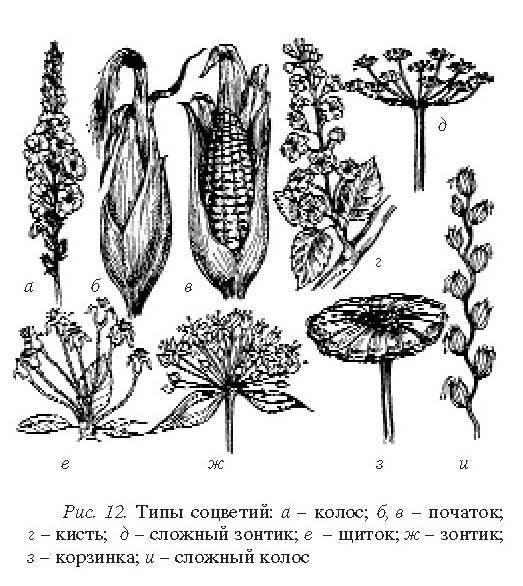 Два и более цветка, собранные на одном стебле, образуют соцветие. Соцветия (рис. 12) делятся на простые (кисть, колос, початок, щиток, сережка, метелка, зонтик, головка, корзинка) и сложные (сложный колос, сложный зонтик, сложный щиток).
