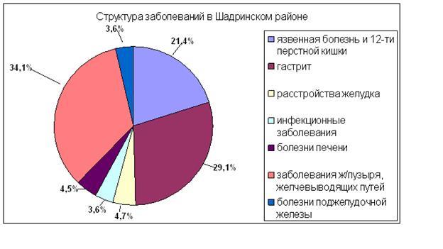Заболевание пищеварительной системы широко распространены среди населения. Характер и частота их зависят от географических, социальных условий, исторически сложившегося образа жизни и особенностей питания, от гигиенического воспитания и культуры населения, уровня развития здравоохранения. Структуру заболеваний в Шадринском районе можно рассмотреть по диаграмме.