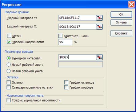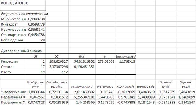 Проведем идентификацию с помощью «Пакета анализа - Регрессия» ППП Excel.