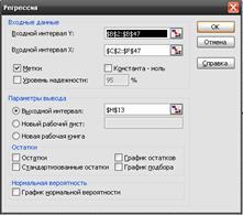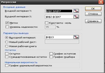 Команду Сервис – Анализ данных. В диалоговом окне выберем инструмент Регрессия, а затем ОК. В поле Входной интервал У введем адрес значений У из заданной таблицы. В поле Входной интервал Х – адрес значений Х.