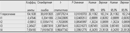 У=104,16 – 0,48Х1 – 0,59Х2 + 2,25Х3 + 7,55Х4