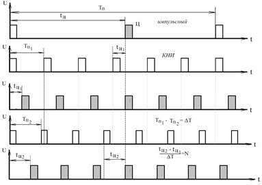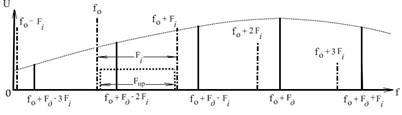 )). При этом достаточно иметь информацию об одной из спектральных составляющих. В виду того, что спектр такого сигнала линейчатый и спектральные составляющие расположены через одинаковые частотные промежутки, то для приемника КНИ, для перекрытия всего диапазона скоростей, достаточно иметь полосу пропускания значительно уже, чем у приемника с непрерывным излучением и соизмеримую с частотным промежутком между спектральными составляющими.