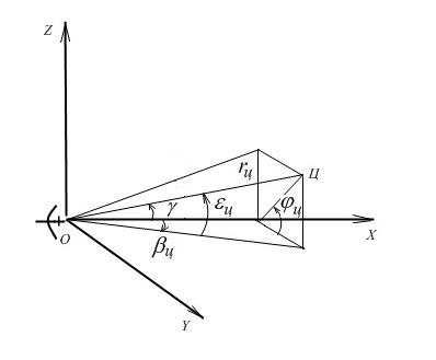 Измерение координат цели осуществляется в системе координат связанной координатором. Считаем, что начало этой системы совпадает с антенной координатора (Рис. 2), при этом, как уже отмечалось, ось координатора может и не совпадать с осью антенны. Направление ОЦ соответствует дальности до цели rц