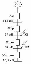 3. Питание может быть осуществлено от подстанции энергосистемы, на которой установлены два параллельно работающих трансформатора мощностью по 40 МВА, напряжением 115/37/10,5 кВ. Мощность системы 650 МВА, мощность короткого замыкания на шинах 115 кВ равна 880 МВА.