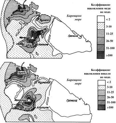 Рис. 3. ЗАГРЯЗНЕНИЕ РАСТИТЕЛЬНОСТИ Кольского полуострова медью и никелем.