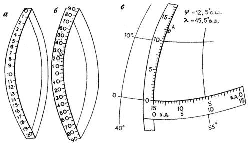 Рис. 30. Кольцевые шкалы и способ определения географических координат по ним