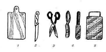 1 – разделочная доска, 2 – нож, 3 – ножницы, 4 – рыбочистки, 5 – терка.