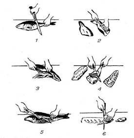1 – очистка от чешуи, 2 – потрошение, 3 – пластование, 4 – срезание ребренных костей (филе с кожей), 5 – срезание мякоти с кожи (филе без кожи и реберных костей), 6 – нарезание порционных полуфабрикатов.