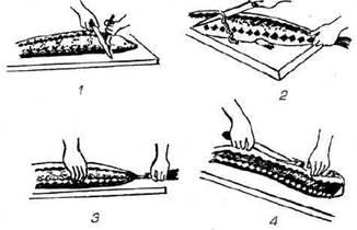 Разделка рыбы на филе с кожей и реберными костями (рис. 4). Рыбу массой 1-1,5 кг и более очищают от чешуи, разрезают брюшко от головы до анального отверстия и удаляют внутренности. Прорезают мякоть у края жаберных крышек и удаляют голову, а затем плечевую кость. Выпотрошенную рыбу промывают и пластуют, разрезая рыбу вдоль спины. После пластования с одной половинки срезают позвоночную кость и получают два филе с кожей и реберными костями.