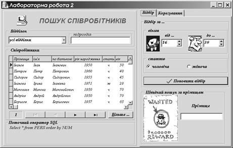 • фільтрації записів БД із виведенням на екран записів, обраних у діалозі за вказаними критеріями;