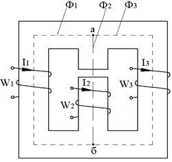 Применяем метод двух узлов. Показываем магнитные потоки. Принимаем направление узлового напряжения от узла «а» к узлу «б». Уравнение по законам Кирхгофа: