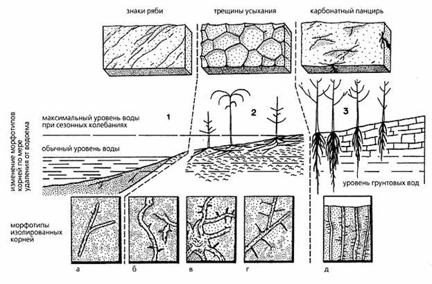 Реконструкция растительных сообществ Русской платформы в позднетатарское время. Мелководную зону (1) с характерными для нее отложениями, иногда сохраняющими знаки ряби, занимали, видимо, водоросли. От них не осталось почти никаких следов, а редко встречающиеся здесь тонкие корешки (а) попали сюда из размытых почв более дальних мест. В следующей, периодически пересыхающей, зоне (2) произрастали эфемероиды с приповерхностными разветвленными корнями разных морфологических типов (б, в, г). Остатки таких корней обнаружены и в палеотакырах — древних почвах, поверхность которых покрыта трещинами усыхания. Вдали от берега, куда не доходила вода даже в периоды ее максимального уровня, развивалось сообщество фреатофитов — растений, которые поглощали глубоко залегающую грунтовую воду мощными длинными корнями (д). Их остатки встречаются в виде кальцитовых трубок в породах с карбонатными панцирями. Такие же окаменелые части корней в соответствующих слоях найдены в котельническом разрезе.