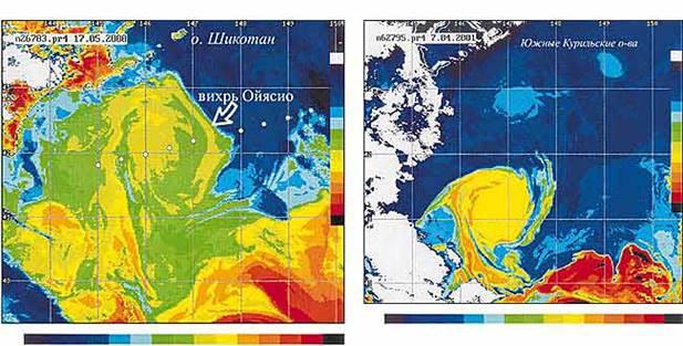 . В сентябре 1990 г. он достиг широты пролива Буссоль (46.5°с.ш.), отделяющего южную группу Курильских о-вов от средней. Даже так далеко от места своего появления он содержал теплое и соленое ядро в верхнем слое воды (что обычно для вихрей Куросио у побережья Японии) и ядро низкой солености в промежуточных слоях (250-600 м). (Из-за этого вихри Ойясио называют вихрями с пресным ядром.) Слежение за вихрем проводилось с помощью последовательных съемок [2-6] на судах Тихоокеанского океанологического института (ТОИ) и непрерывных спутниковых изображений, принятых и обработанных в Институте автоматики и процессов управления ДВО РАН.