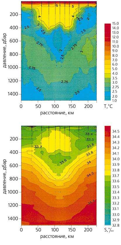 Температура (°С) и соленость (‰) в вихрях Ойясио (числа на изолиниях) в сентябре 1989 г. (вверху) и в феврале 2000 г. На разрезах вверху хорошо заметно холодное и пресное ядро, расположенное под теплым и соленым. На рисунках внизу видно, что вихрь содержит мощное теплое и соленое ядро. Диаметр вихря превышает 200 км, а глубина ядра больше 700 м. Разрезы построены с использованием данных научно- исследовательского судна “Мирай” (Японское агентство по морским наукам).