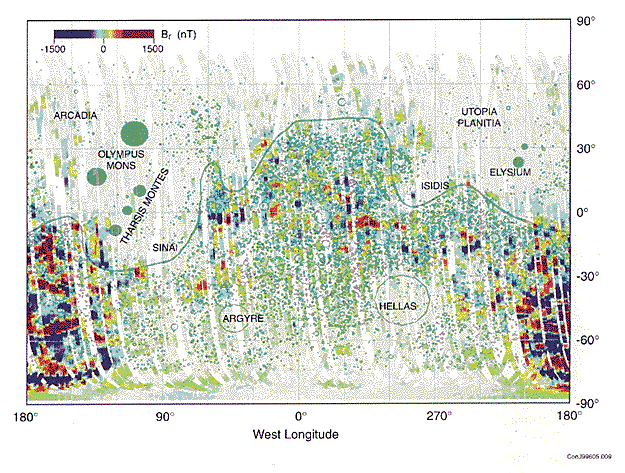 Распределение магнитного поля, окружающего Марс, полученное при помощи «Mars Global Surveyor».