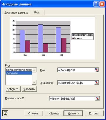 Ряды можно добавлять или удалять, давать им название (название можно определить как ссылку на ячейку) и определить подписи по оси. Диаграмму можно создавать, определяя по отдельности каждый из рядов данных. Для перехода к следующему шагу нужно нажать кнопку Далее