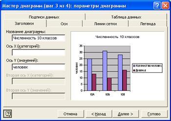 Окно параметров диаграммы содержит от 3 до 6 вкладок, позволяющих оформить диаграмму так, как она должна выглядеть. Количество вкладок зависит от типа диаграммы. К параметрам диаграммы относят: Заголовки, Легенду, Подписи данных, Оси, Линии сетки, Таблицу данных