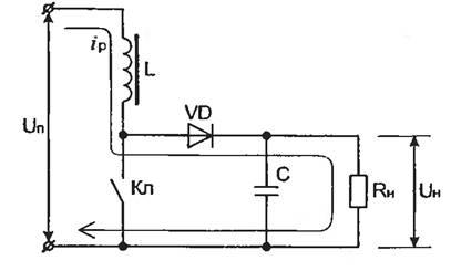 Мы уже хорошо знаем, что основное свойство индуктивного элемента - стремление к поддержанию величины и направления протекающего через него тока. Поэтому при размыкании ключа направление разрядного тока ipсовпадет по направлению с зарядным током i. Разрядный ток замыкается через диод VDна нагрузку и подзаряжает конденсатор С, как показано на рис.4.